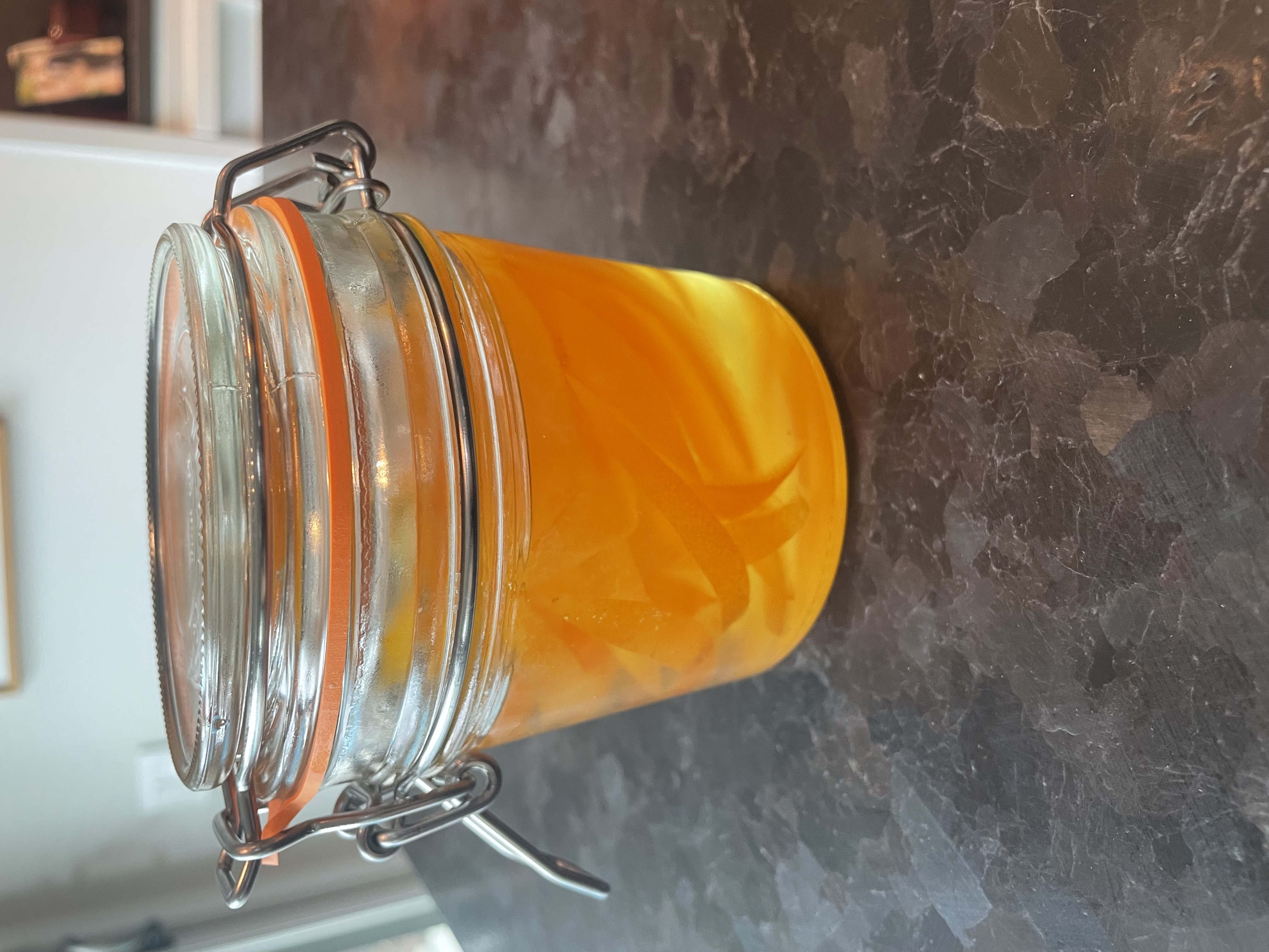 Cool slightly and then pour into the glass jar(s) over the peels